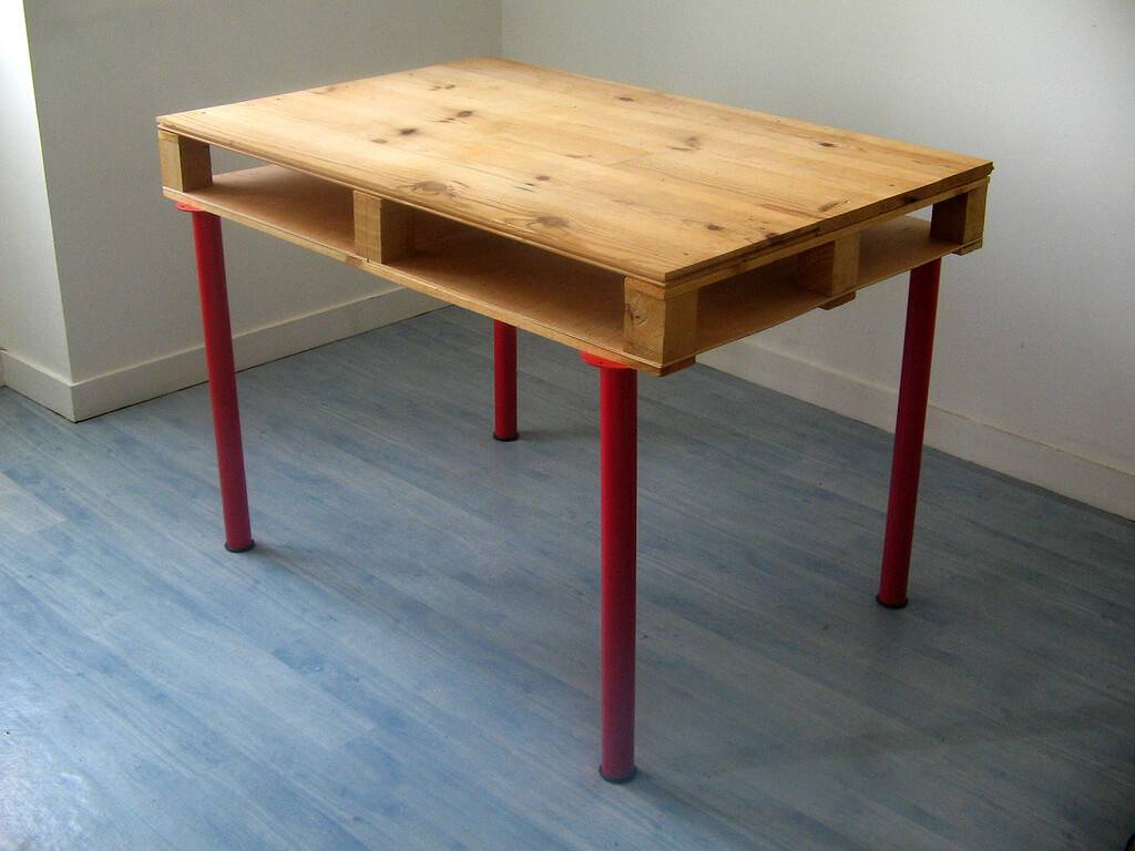 Тем не менее, эстетически универсальные варианты исполнения мебели из поддонов возможны, если изделие относительно небольшое, в обстановке композиционно не доминирует и снабжено какими-то деталями, создающими визуальные переходы от зрительно грубоватого «ядра» из поддонов к общему декору. Как пример можно привести рабочий столик, вписывающийся в квартиру практически любого оформления, кроме откровенно-вычурных стилей (ампир, барокко, шебби-шик и т.п.), см. рис.: