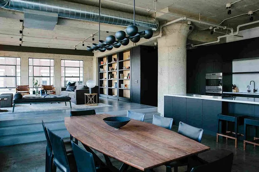- вентиляционные воздуховоды, трубы, балки перекрытия, провода и прочие элементы инженерных систем не маскируются, а выставляются напоказ. Эти детали и задают тот особенный индустриальный стиль;