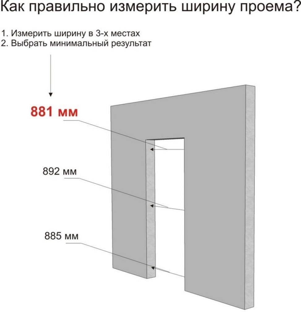 Одного измерения будет недостаточно – необходимо трижды снять мерки, а затем выбрать наименьшее число из полученных. Измерять дверное полотно следует вверху, внизу, посредине.