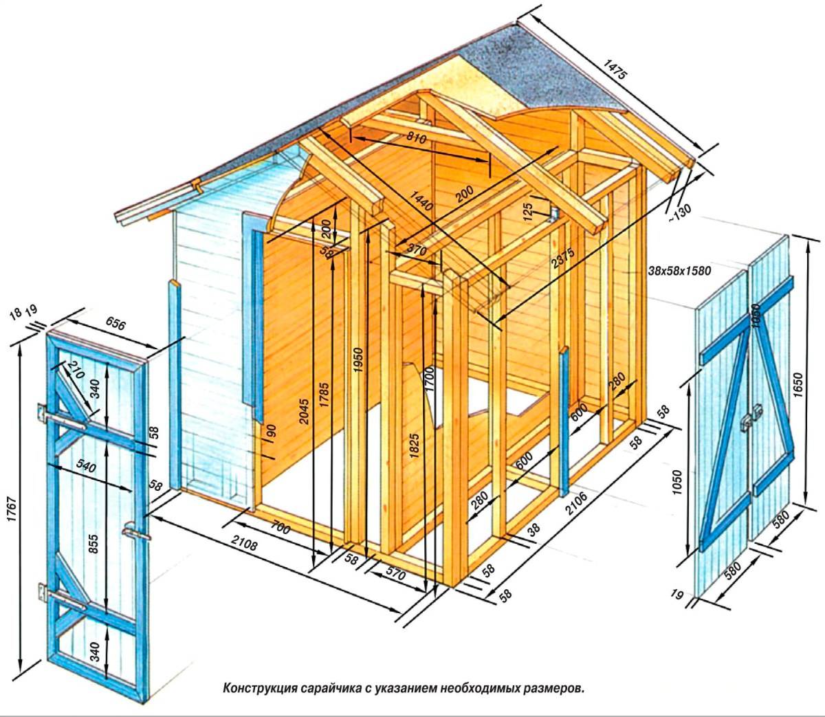 Перед началом работ следует рассчитать габариты будущего сарая с учётом целевого использования, размера инструмента и других предметов, которые там будут храниться. После этого необходимо сделать чертёж, на котором отразить расположение стен, дверей или окон. Далее на основании габаритов желательно подготовить схему каркаса будущей постройки, на которой будут отмечены места расположения опорных и обвязочных стоек. Это значительно упростит расчёт необходимых строительных материалов и процесс монтажа, которые делаются на следующем этапе.