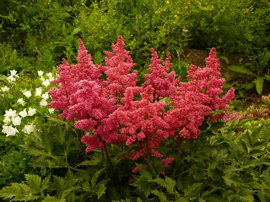 Это теневыносливое растение с высокими соцветиями-метелками растет пышными кустами с резной листвой. Астильба отличается продолжительным цветением, очень декоративна, сохраняет свою красоту с июня до сентября.