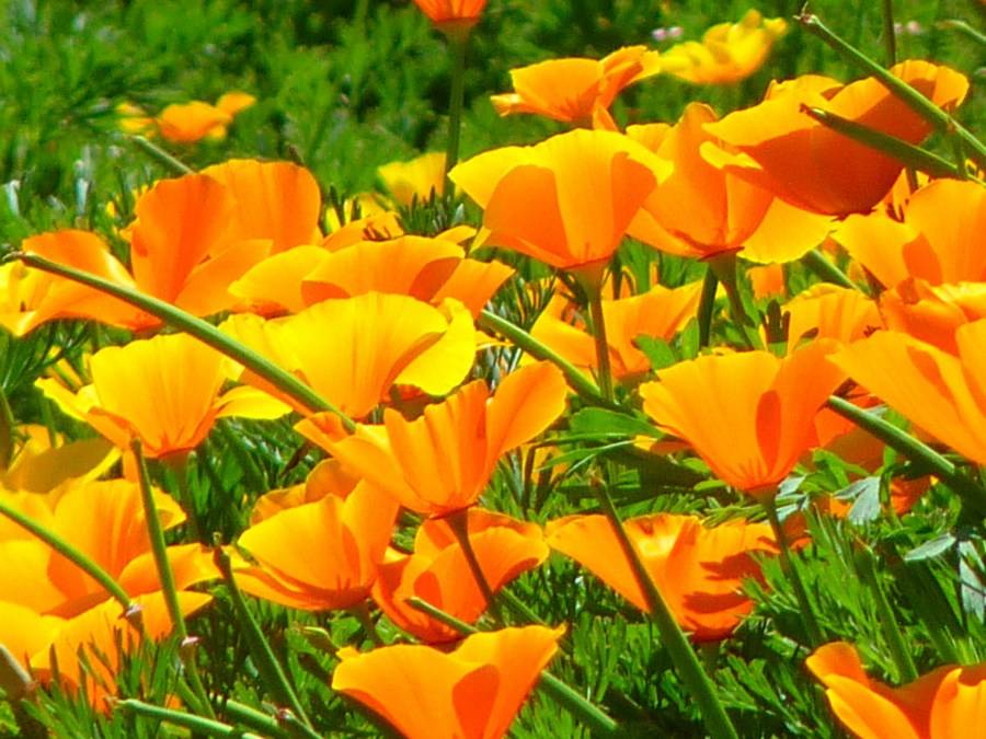 Желто-оранжевая и красная палитры: нарциссы, тюльпаны, калифорнийский мак, канны, примулы, дороникум, купальница, ирисы, рудбекия, флокс метельчатый, маргаритки, мак восточный, гвоздика китайская и бородатая, камнеломка, астильба Давида, монарда двойчатая.