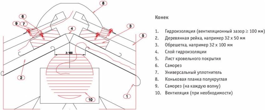 Схема монтажа конька для крыш с треугольным или трапециевидным скатом