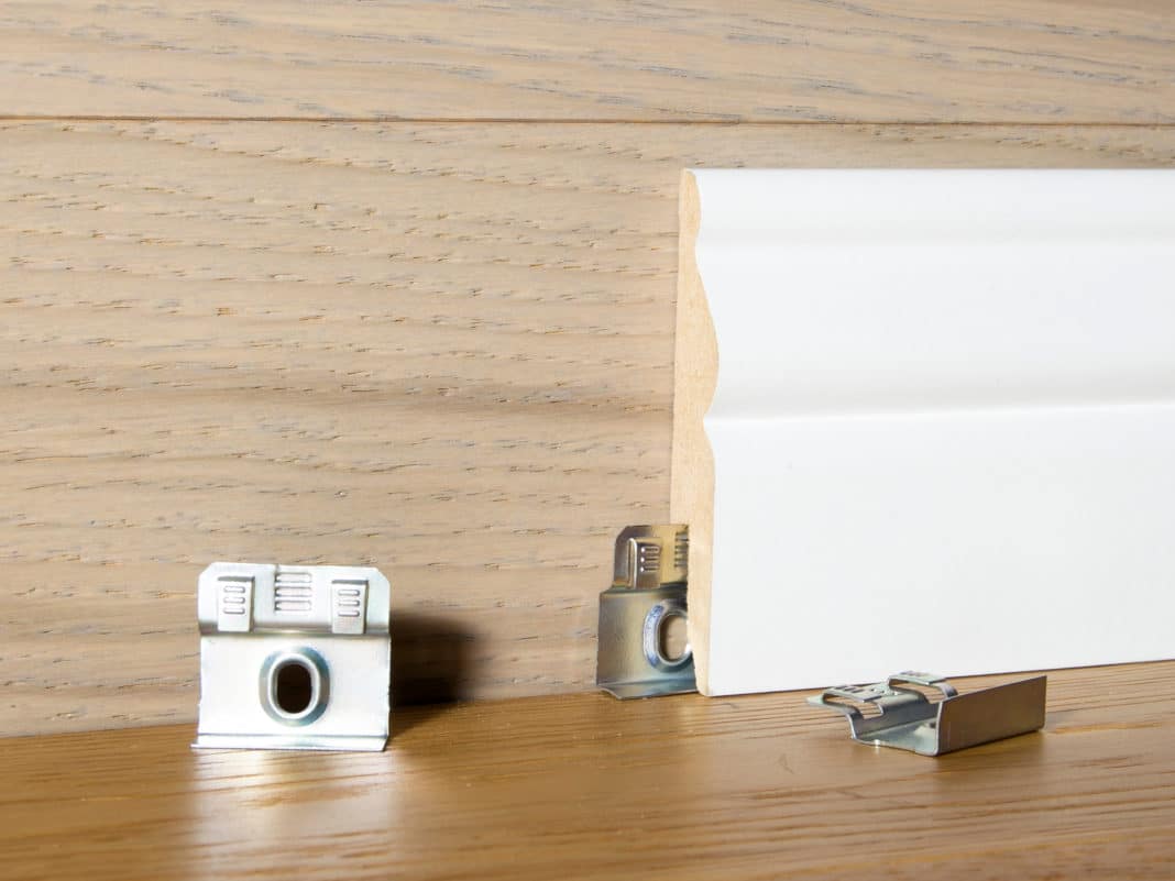 Клипсовые крепежи используют для установки обычных декоративных плинтусов без кабель-каналов. Они позволяют аккуратно зафиксировать планку, не нарушая ее декоративной поверхности саморезами, гвоздями или другими наружными крепежами. Сами клипсы и тыльная сторона плинтуса сконструированы так, что после монтажа крепления к стене вам остается просто зафиксировать хлыст на клипсах. Если профиль установлен именно таким образом, вы с легкостью можете в любой момент выполнить демонтаж. Однако при вторичной установке панели редко удается избежать дефектов, поскольку крепления и пазы планки очень ненадежны и быстро приходят в негодность. Так, поскольку фиксирующие элементы расшатываются, клипсовое крепление рекомендуется применять только в том случае, если пол и стены в комнате идеально ровные.
