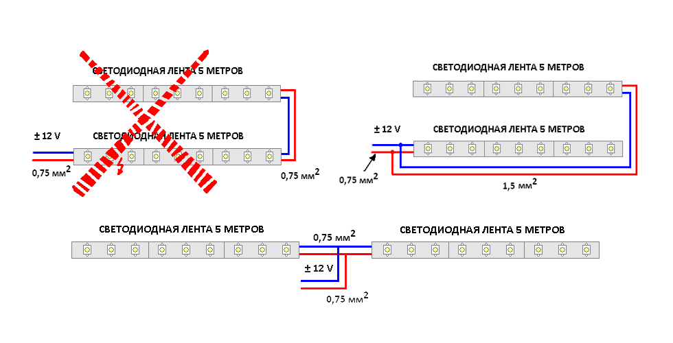 Подключение светодиодного освещения производят параллельно, используя отрезки длиной до 5 м.