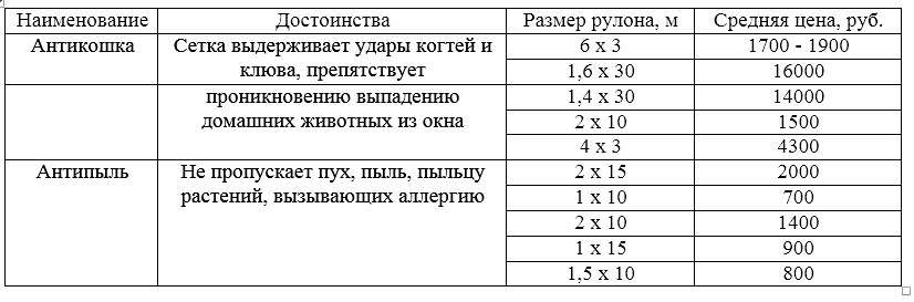 В России для изготовления москитных сеток применяют полотна двух видов, характеристики некоторых представлены в следующей таблице: