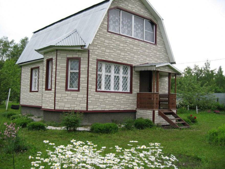 Среди несомненных лидеров во внешней отделке для дачного дома — это, несомненно, сайдинг. Отделка дачного дома сайдингом является одним из наиболее доступных в финансовом плане вариантов. Сайдинг легко монтируется (при наличии определенных знаний и навыков такую работу вполне можно выполнить самостоятельно). Этот материал позволяет быстро «зашить» дачный дом снаружи, надежно спрятать утеплитель, буквально преобразить старое здание всего за несколько дней. Крепится сайдинг на специальный профиль, а производители гарантируют, что такая отделка будет надежно служить от 20 до 35 лет.