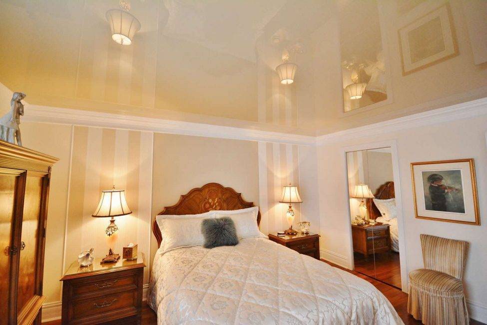 Если форма комнаты правильная, то вполне достаточно будет одноярусного натяжного потолка, для комплектации которого могут быть использованы встроенные светильники, выделяющие зону кровати. В случае ее установки рядом с окном, от светильников можно отказаться, заменив их расположенной посреди потолка люстрой. А вот зональное освещение в таком случае будет осуществляться при помощи расположенных у кровати бра.