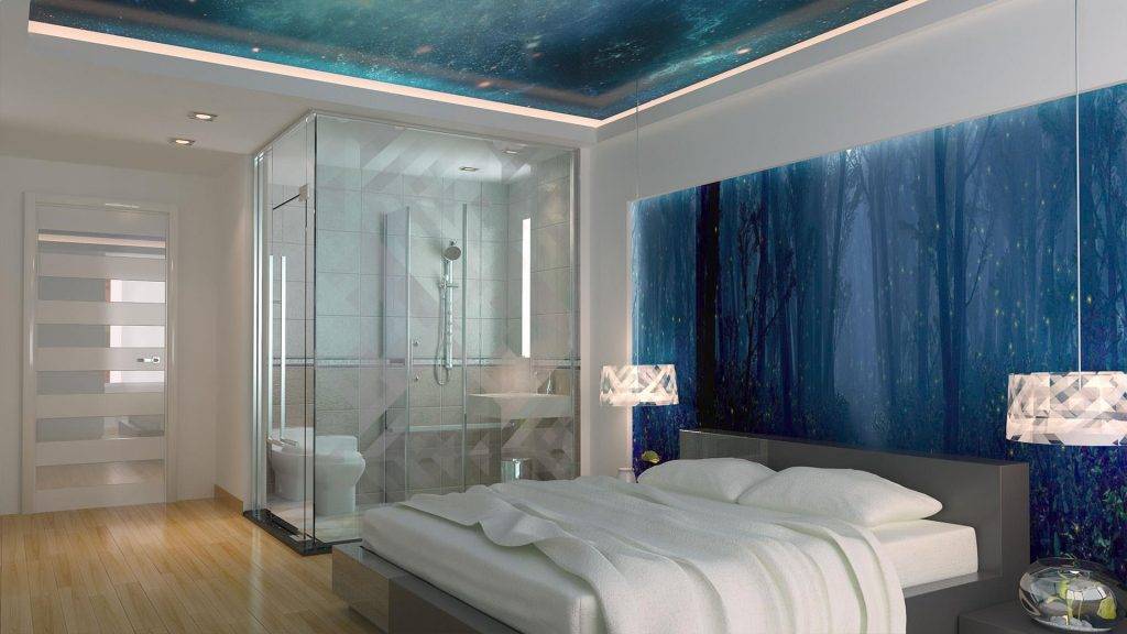 Для спален рекомендуют однотонные ненавязчивые тона, но не ограничивают стандартными решениями. Так, для оформления потолка можно рассмотреть: