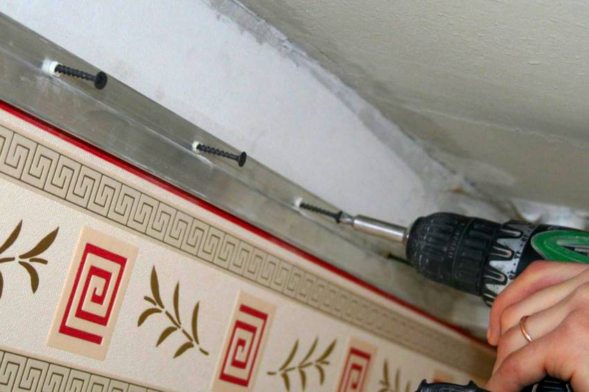 Принцип монтажа багетного профиля ничем не отличается от схемы крепежа иных потолочных конструкций. Профилированная металлическая рейка крепится на стене с помощью саморезов и пробок. Но для натяжных потолков есть одна особенность, профиль не режут на куски по длине стен, а только надрезают и ломают на нужный угол поворота. В углах багет обязательно должен быть цельным, только на прямых линиях стен допускается сращивание в торцы.