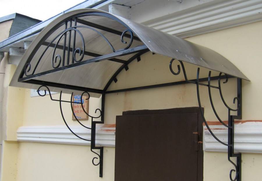 Такую форму применяли и раньше. Для покрытия использовали металлические листы. Сейчас кроют кровлю современными материалами, в частности сотовым поликарбонатом. Материал отличается гибкостью и легкостью монтажа. Кроме того, такой козырек выглядит довольно оригинально и презентабельно.