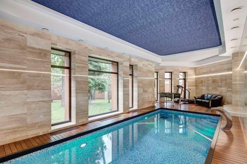 Одно крыло дома отвели под спа-комплекс с баней и сауной. После жаркого пара можно окунуться в большой бассейн с искусственным водопадом, стенки которого облицованы мозаикой. Пол в зоне отдыха выложен террасной доской с защитным влагостойким покрытием.