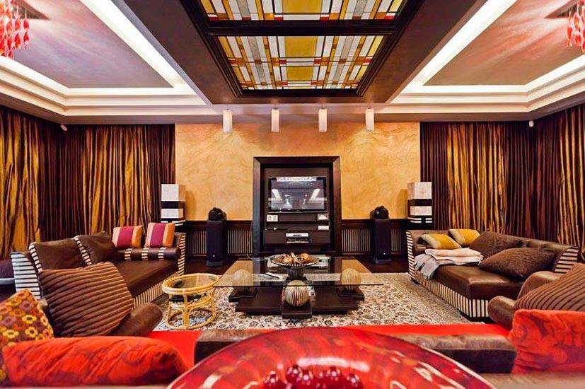 Гостиная представляет собой настоящий музей, над каждой деталью которого тщательно поработали профессионалы. Потолок разделён на три части, центральная украшена изысканными цветными витражами с внутренней подсветкой. По обе стороны установили эффектные светильники с хрустальными алыми капельками.