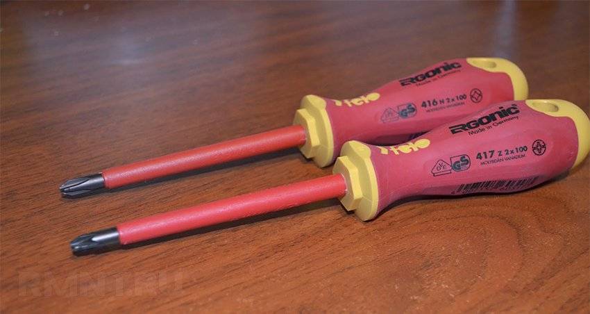 В наборе желательно иметь прямые и крестообразные отвертки различной величины (одну мощную короткую, а другую с длинным жалом для работы в труднодоступных местах). При покупке лучше отдавать предпочтение инструменту, на ручках которого стоит отметка «1000V»