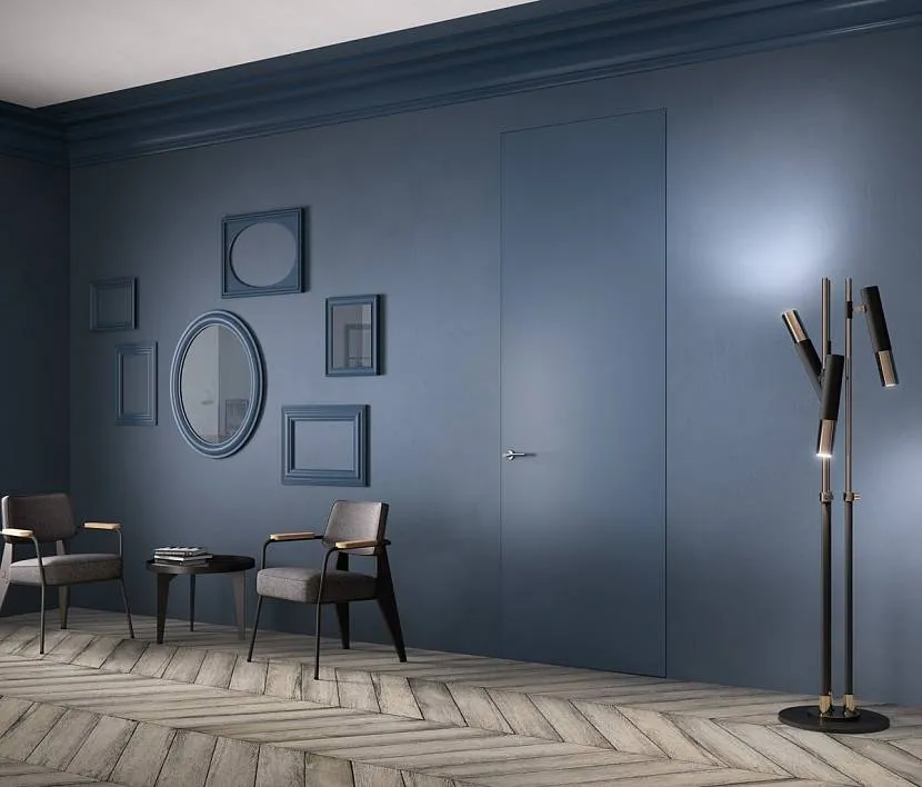 - Дверное полотно из специального материала, который можно шпаклевать, красить и даже оклеивать обоями. Называется такое полотно просто – под отделку. Кроме него, подобные двери могут изготавливаться в виде уже декорированного изделия – дело в том, что межкомнатные двери со скрытым коробом не всегда стремятся спрятать. Достаточно часто они служат большим контрастным пятном на стене – таким способом создается изюминка в помещении.