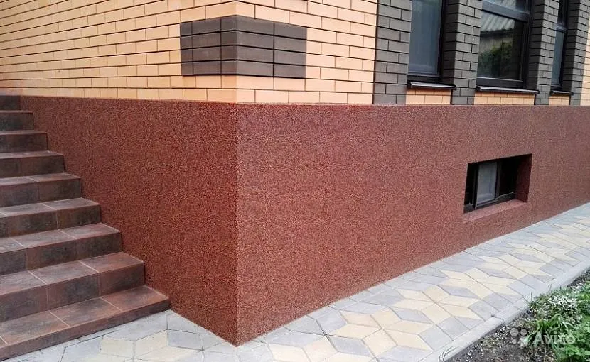 Еще один неплохой пример оформления цоколя – покрытие основания штукатуркой «короед». После нанесения штукатурки поверхность напоминает структуру дерева, изъеденного короедом, что выглядит весьма оригинально. В состав мозаичной штукатурки входит смола, которая делает покрытие водонепроницаемым.