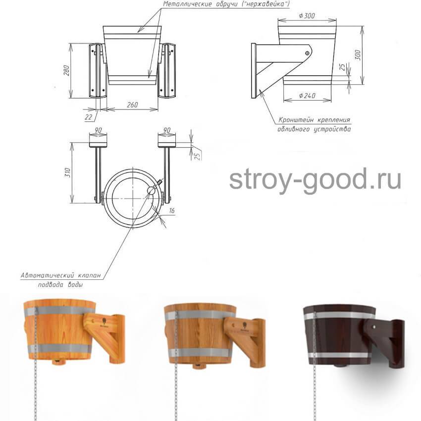 Так что же представляет собой водопад для бани? Это деревянное ведро, скрепленное металлическими кольцами. Его объем может быть самым различным, но чаще всего встречаются ведра на 12-20 литров. Оно крепится к стене кронштейнами. Над ним проходит шланг, из которого в емкость поступает прохладная вода. Обычно ведро наполняется еще до посещения парильни. Рекомендуется выбирать тару их экологически чистого высококачественного материала. К наиболее популярным материалам относится дуб мореный, который обладает прочностью и долговечностью.