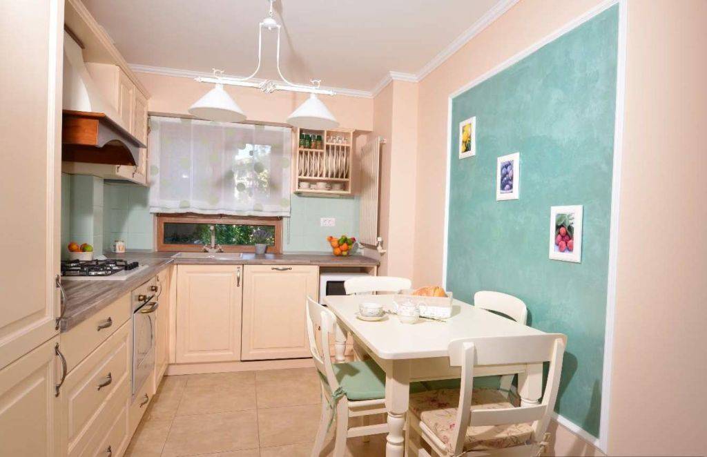 Невозможно не обратить внимание, подбирая по фотографиям обои, что для уюта и создания приятной домашней обстановки прекрасно подходят именно нежные, пастельные оттенки (перечисленные выше). Благородное и мягкое сочетание с желтым (еще одним цветом, благоприятно влияющим на аппетит) – отличный вариант для этого помещения