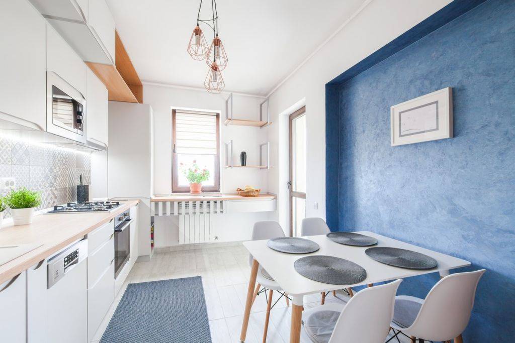 - синий – подходит для кухонь в морском и средиземноморском стилях, нуждается в дополнении другими оттенками морской волны, а также чистого белого цвета.