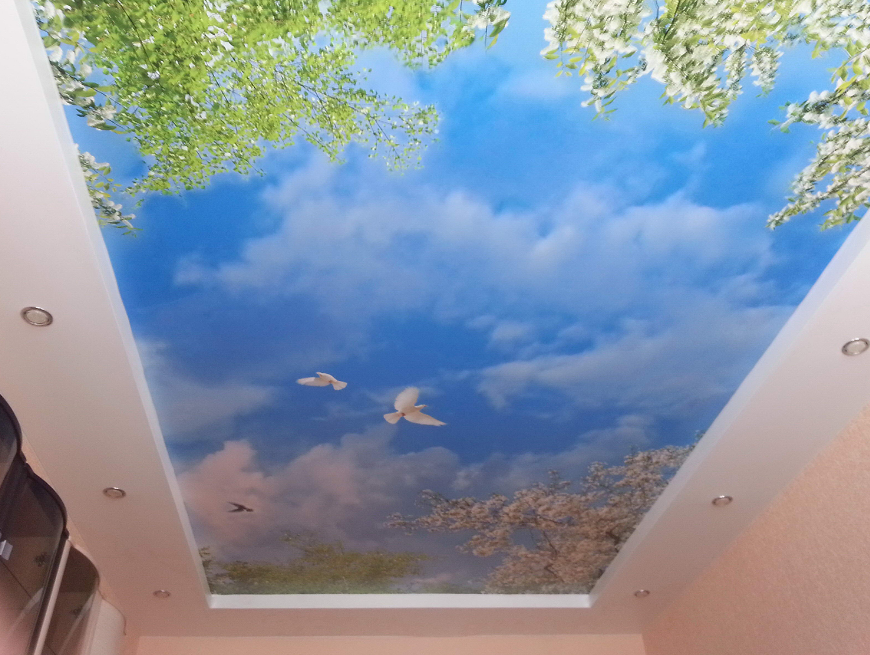 Отличным решением является установка натяжного потолка с изображением неба внутри гипсокартонной конструкции
