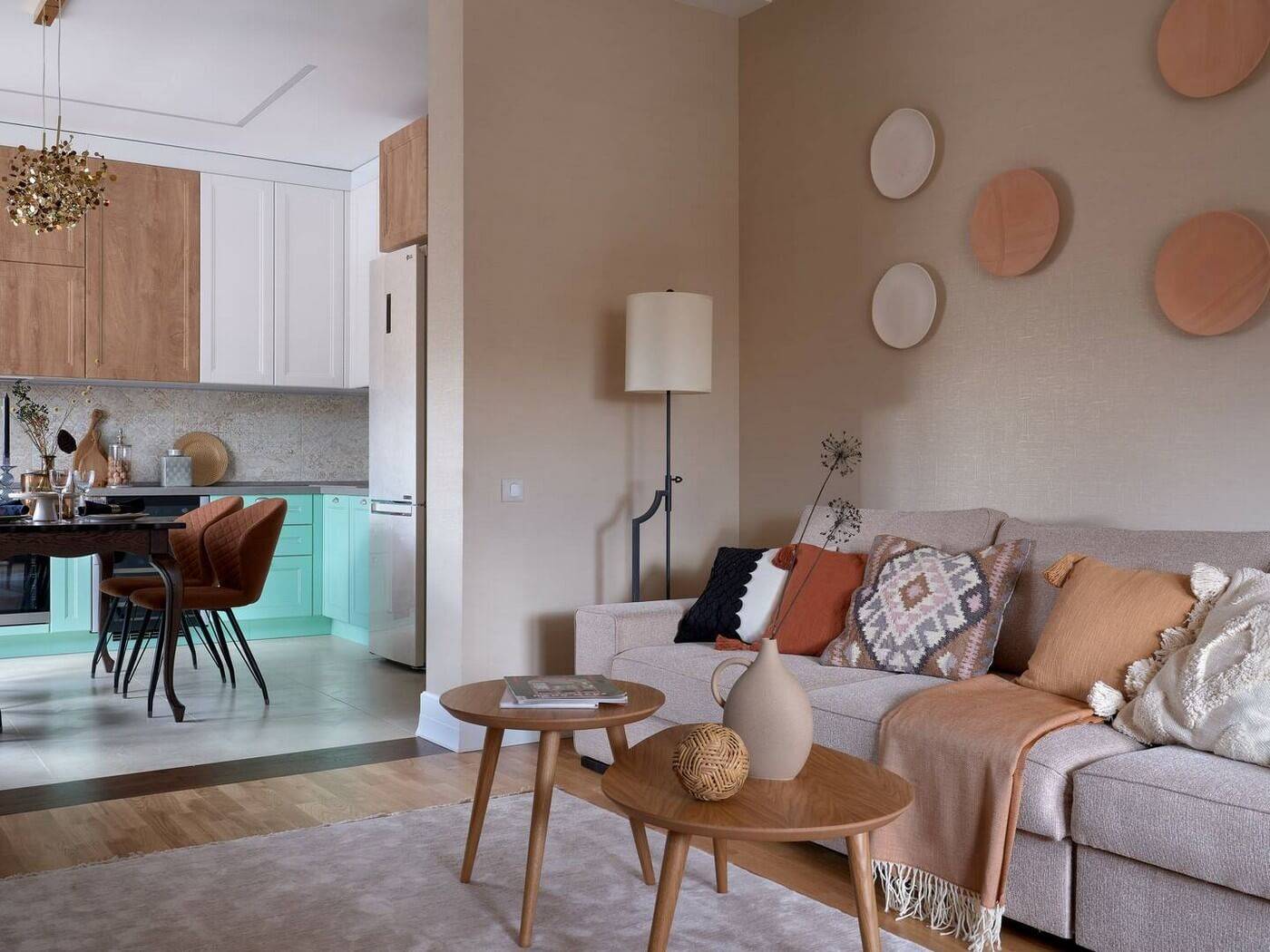 Нежно-персиковый оттенок отлично вписывается в интерьер просторных помещений. Проект квартиры «Элегантный средиземноморский», дизайнер Евгения Ивлиева
