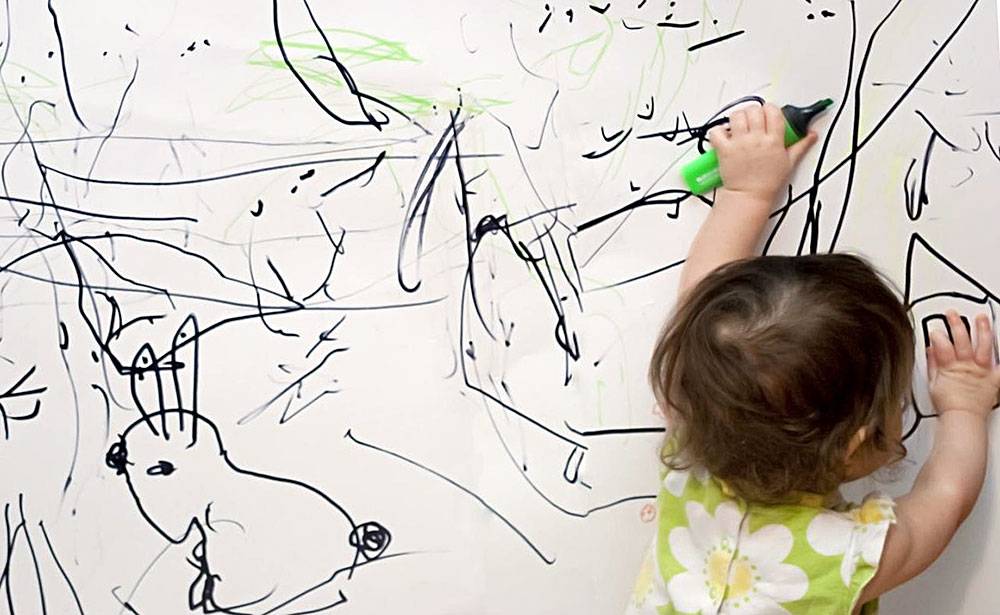 - В зависимости от возраста и предпочтений ребенка, можно наклеить черную магнитную доску. На ней рисуют мелом, после чего стирают художества влажной губкой. Такой материал не только заинтересует хозяина, но и скроет некоторые погрешности стены.