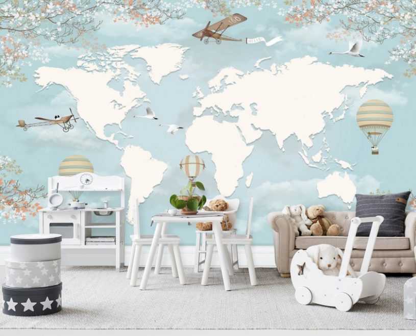 Следующую возрастную группу составляют дети пяти-шести лет. У них наиболее ярко начинают проявляться творческие способности, которые необходимо развивать всеми доступными способами. Оригинальным решением будут комбинированные обои для детской комнаты: декоративное оформление верней части стен и оклеивание нижней части однотонными бумажными материалами, на которых можно рисовать, или предназначенными под покраску, позволяющими без труда скрыть возникающие дефекты. Также очень уместными окажутся на стене изображения животных, растений, цифр, букв алфавита, карта мира.