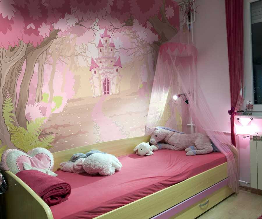 Комната для принцессы – нежно-розовые тона, изображения различных сказочных героев, замков, цветов, сердечек.