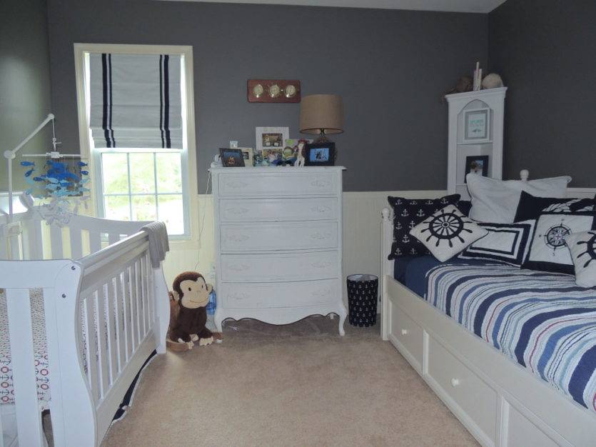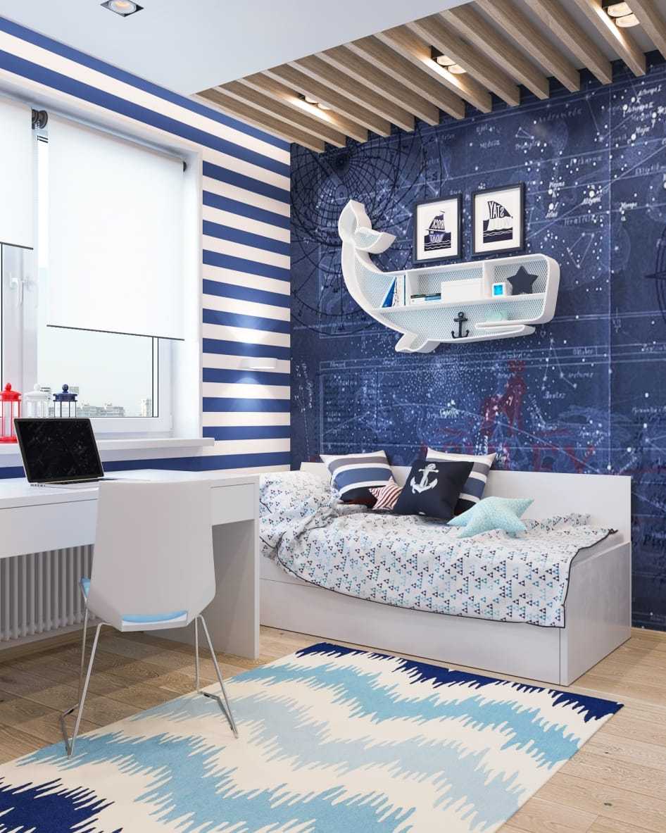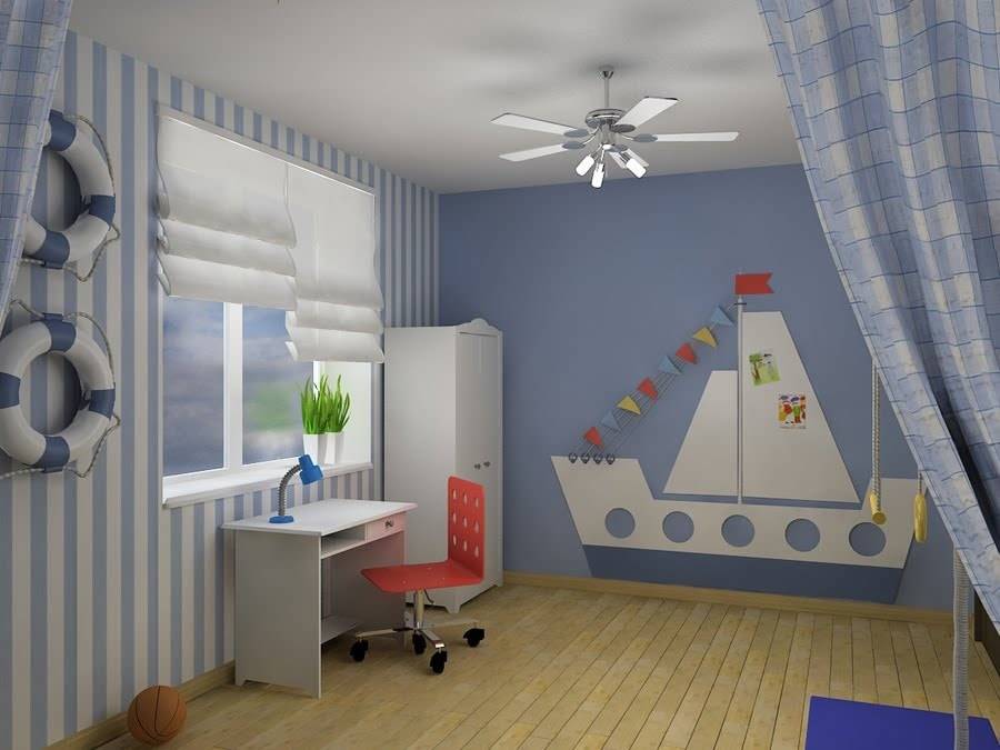 Для мальчиков подойдет оформление комнаты в сочетание белого и темно-синего цвета. Разнообразный декор в форме рыбацких принадлежностей или элементы кораблей сделают для ребенка из комнаты любимое место пребывания.