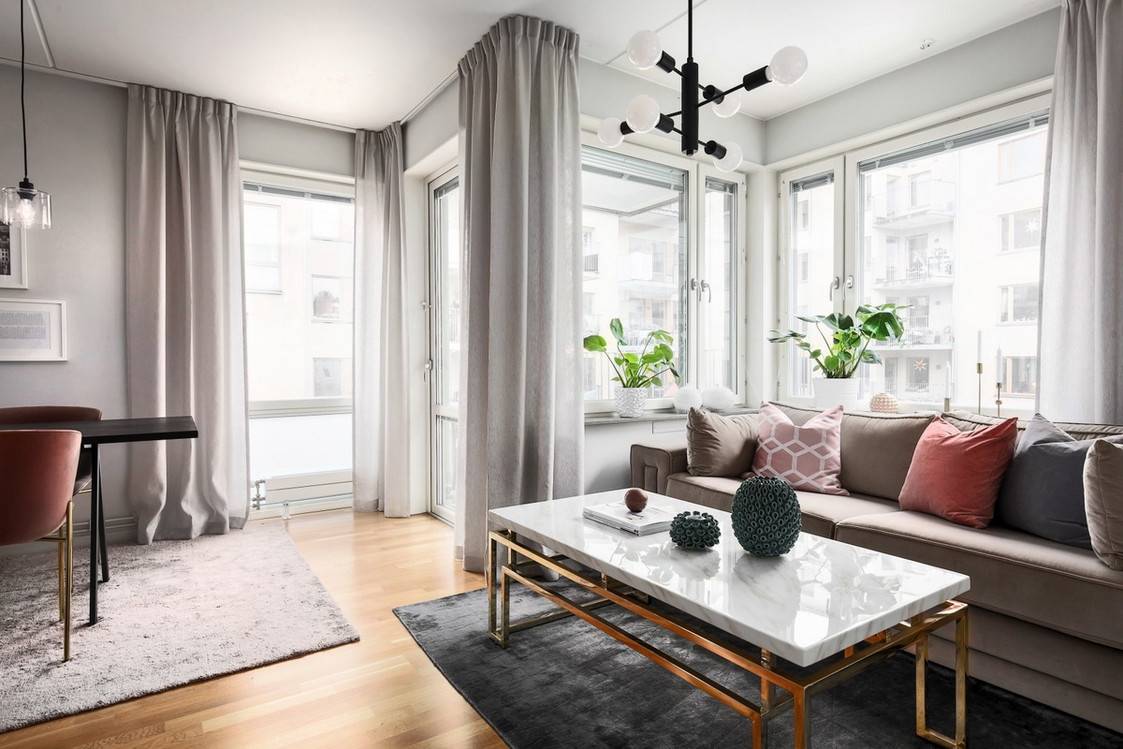 Акцентные занавески на фоне нейтральной гаммы дополняют другими аксессуарами – ковром, подушками на диване и/или парой светильников. В квартире небольшой площади фоном обычно служит белый, и на его фоне прекрасно смотрятся самые разные акценты – бирюзовые, розовые, сиреневые, изумрудные. А вот в более просторных апартаментах фон может быть любым.