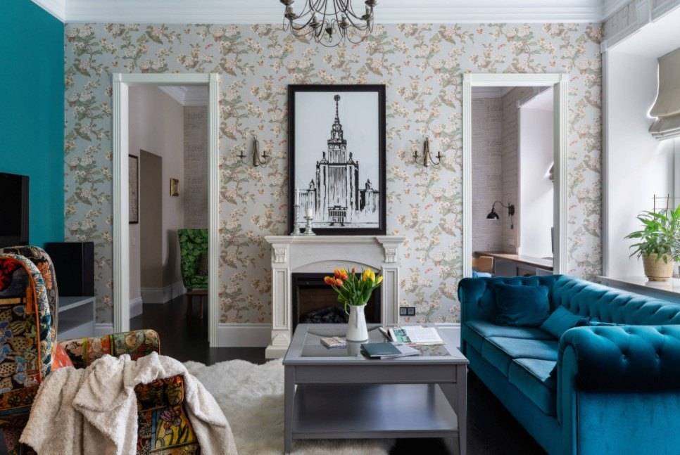 Современный дизайн гостиной с красивыми обоями