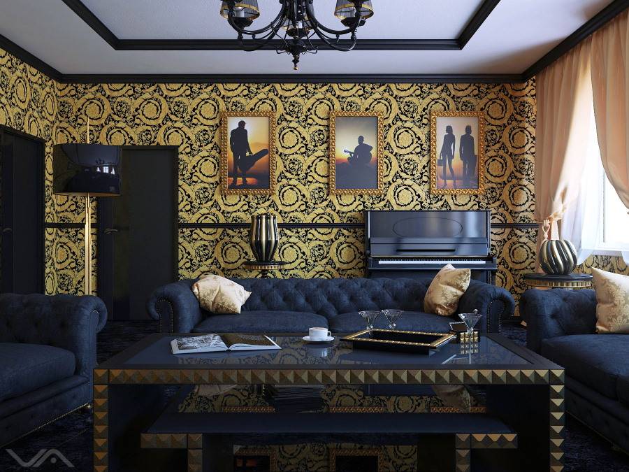 В гостиной стиля арт-деко богато смотрятся черно-золотистые обои с крупным принтом