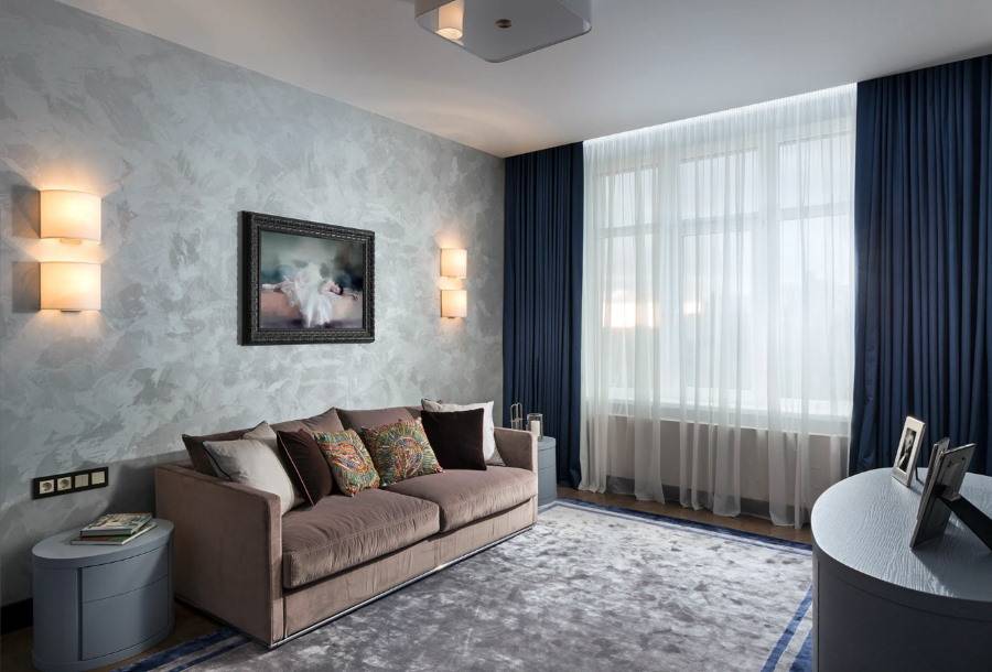 Теплая гостиная с панорамными окнами и холодно — голубыми обоями