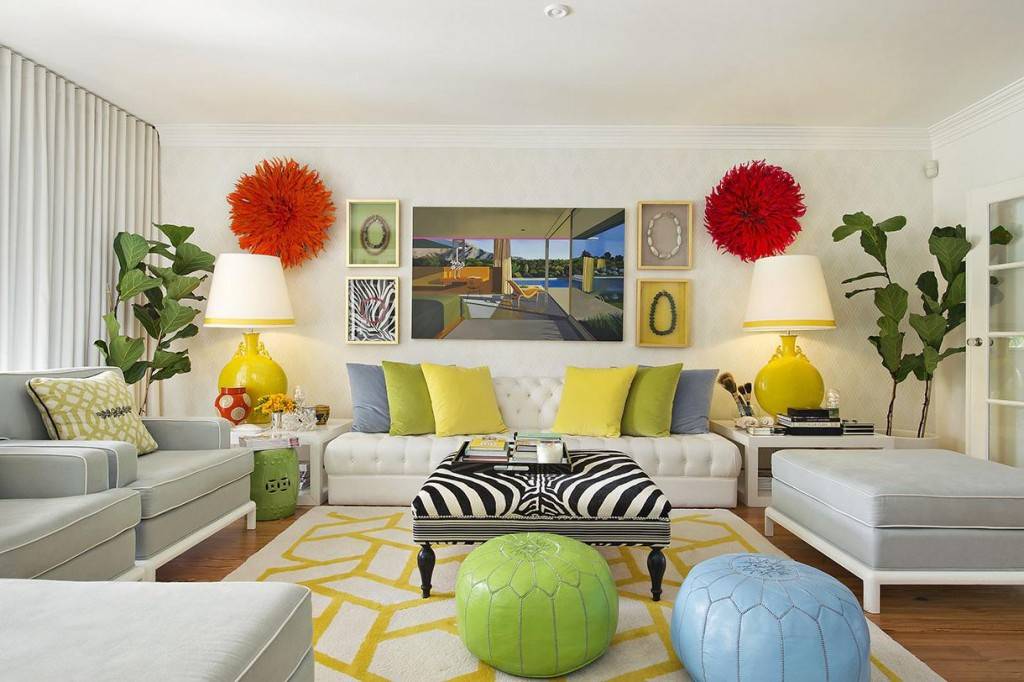 - Яркие шторы + белые обои. Интересное сочетание для больших гостиных. При этом на шторах могут расположиться симпатичные принты.