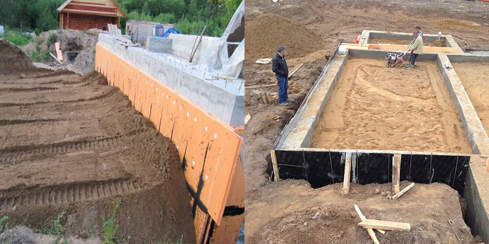 Медлить с процессом засыпки не стоит в том случае, когда местный прогноз погоды свидетельствует о надвигающихся дождях, а стенки конструкции не укреплялись защитной полиэтиленовой пленкой. Если грунт песчаный, то сохраняется надежда на то, что дождевая вода осядет и уйдет естественным путем. При глинистой почке, засыпка фундамента должна быть выполнена до наступления дождей. В обязательном порядке устраивается черновая отмостка. Когда времени недостаточно, то поверхность с обратной засыпкой, сделанной с уклоном под слив, укрывается при помощи полиэтиленовой пленки.