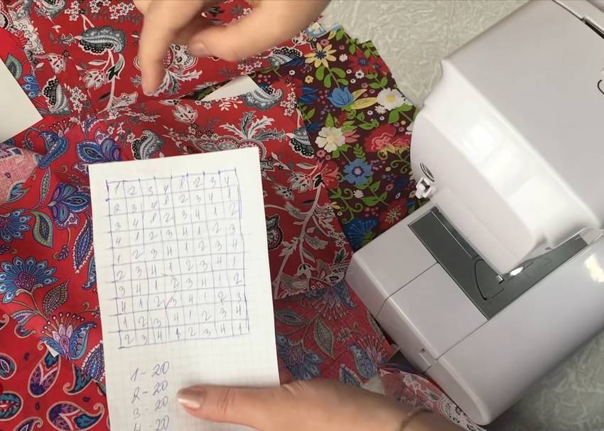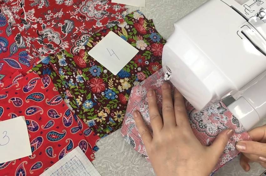 Когда сборка всех лоскутов в полосы завершена, шьем заготовки, сострачивая между собой и используя схемы