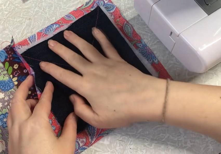 Два квадрата складываем изнанкой наверх, скалываем булавками и прострачиваем. Все швы надо проглаживать с изнанки, располагая их в разные стороны, чтобы не было утолщений.