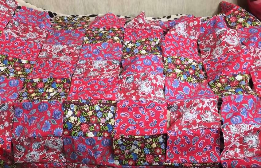 Работа начинается с выкройки и резки ткани. Для создания одеяла необходимо из каждого отреза выкроить по 6 квадратов параметрами 45х45 см. Полученные отрезы выкладываем шарами, чередуя в одинаковой последовательности все имеющиеся квадраты.