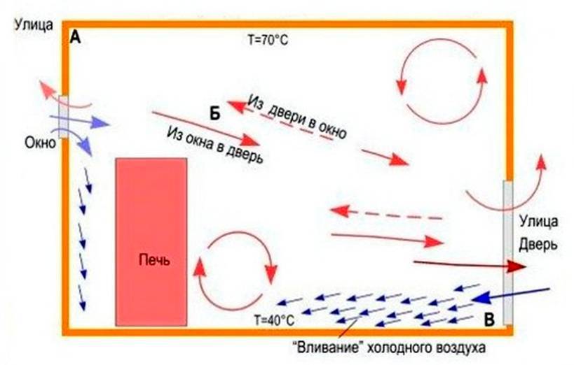 В любом из этих случаев холодный поток, проникающий в помещение, двигается к источнику тепла и вытесняет вверх уже нагретый им воздух. Он при движении прогревает все помещение, постепенно остывая и опускаясь вниз. Здесь он втягивается в поддувало и выводится через дымоход на улицу.