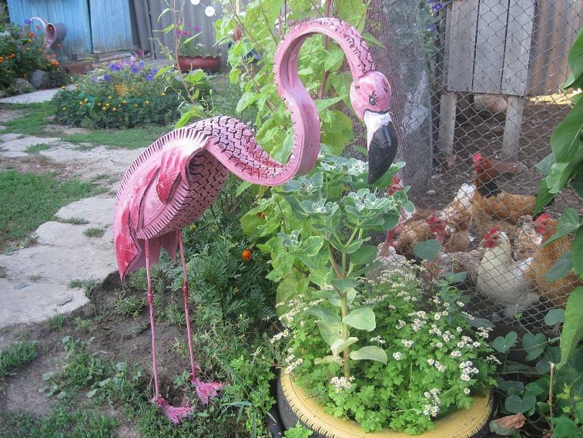 Для оживления клумбы в садике используют уже готовые садовые фигурки или делают их самостоятельно. Например, из обычной покрышки можно вырезать прекрасного лебедя или фламинго, а если покрышек несколько, то создать целую композицию. Есть очень много вариантов создания из покрышек фигурок животных (медведя, лисы, жирафа и других).