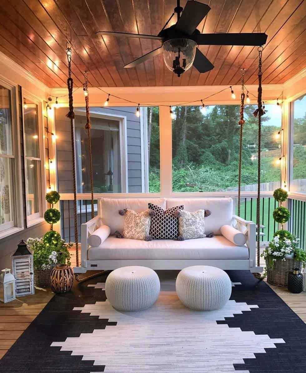 Интересный эффект создают светильники на колоннах, направленные внутрь. Они как-бы отсекают темноту за пределами освещенной области, создавая ощущение уединения. Такое освещение веранды сделать просто: поставить направленные прожекторы или другие подобные осветительные приборы.