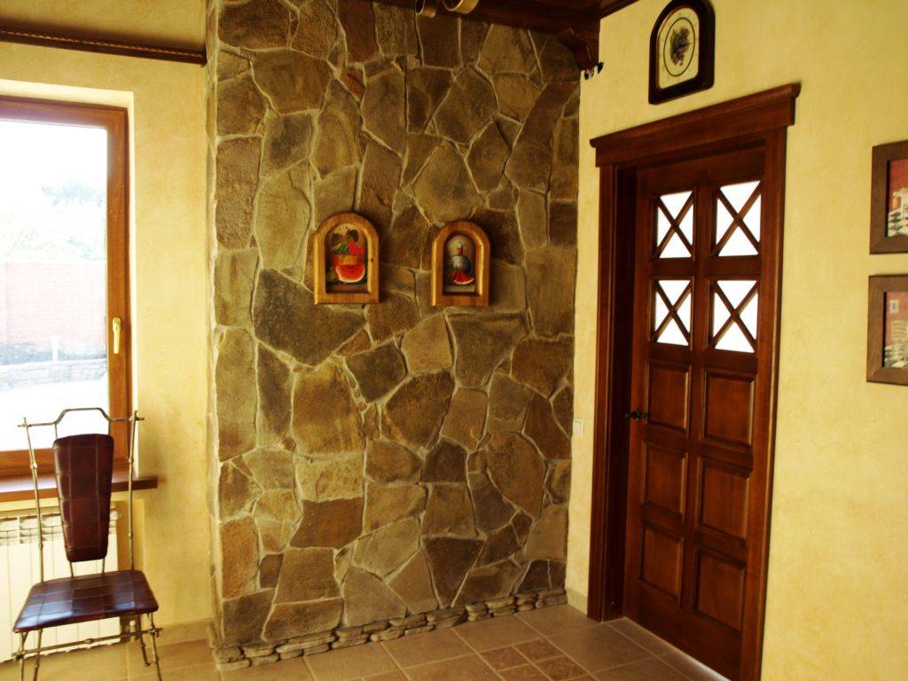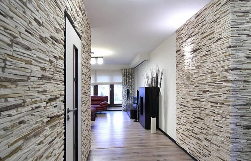 Для внутренней отделки в коридоре чаще всего применяется декоративный камень. Он обладает термоустойчивостью, влагоустойчивостью, не прихотлив в уходе и долговечен при должной эксплуатации.