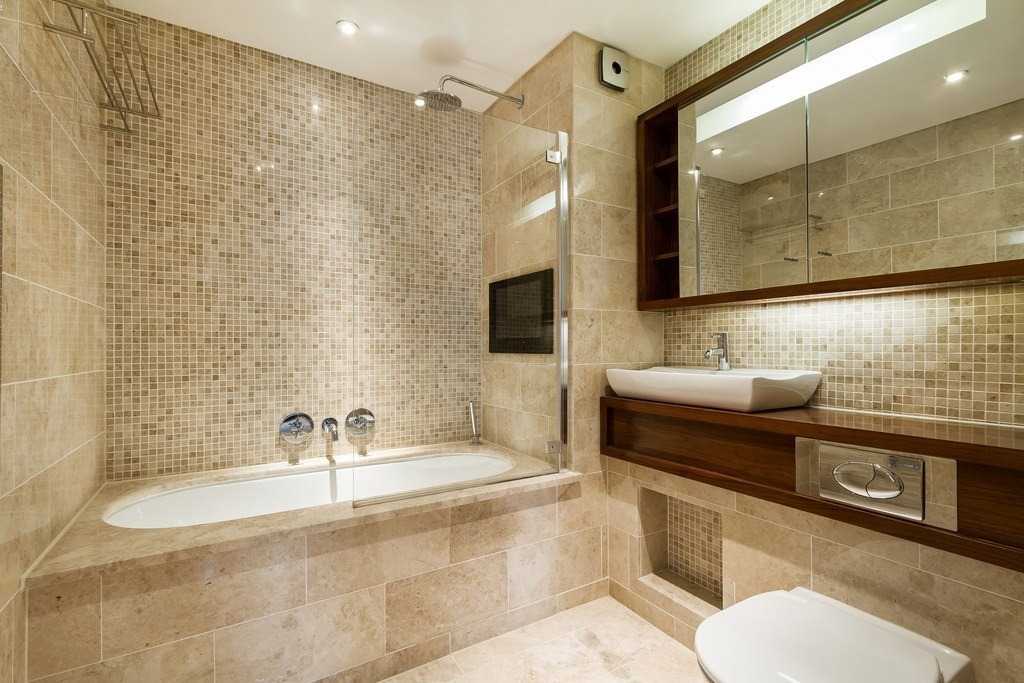 Натуральная отделка раскроется в габаритной ванной, при этом будет незаметной в крохотной. Чтобы комната не выглядела помпезно, облицовку часто комбинируют с другими материалами. Например, с декоративной штукатуркой, окрашиванием или обоями. Частичная отделка поможет расставить акценты или визуально изменить неправильную форму санузла.