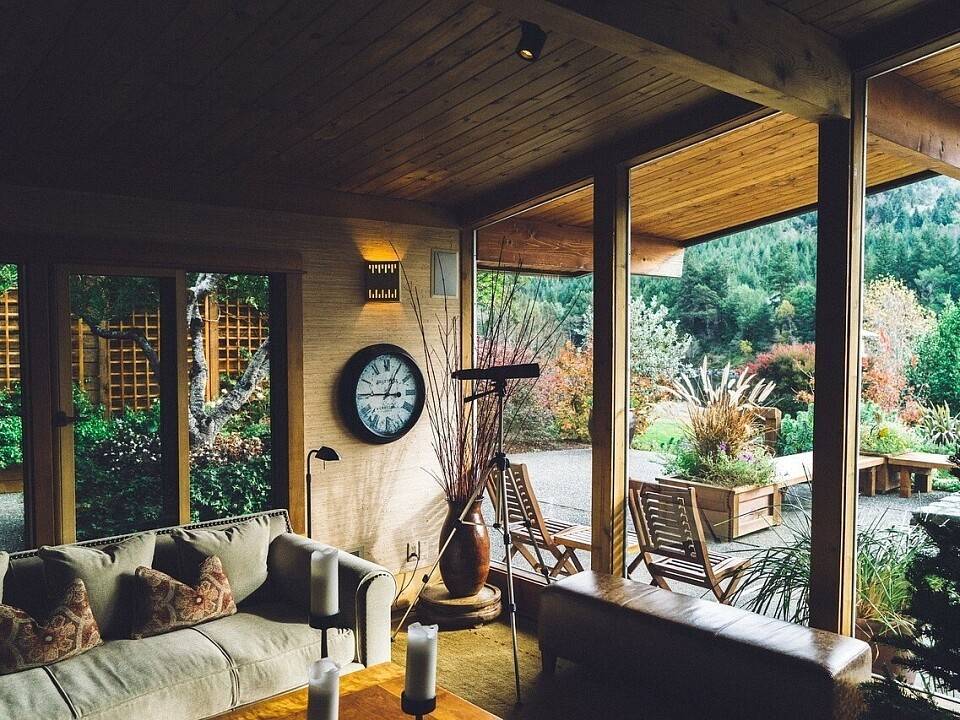 Остеклять пристройку решаются только в том случае, если летний домик эксплуатируют круглый год или же на террасе располагаются вещи, нуждающиеся в защите от природных капризов. Остекление может испортить деревенский домик из дерева, поэтому такой вариант актуален только для современных апартаментов с продуманным экстерьером.