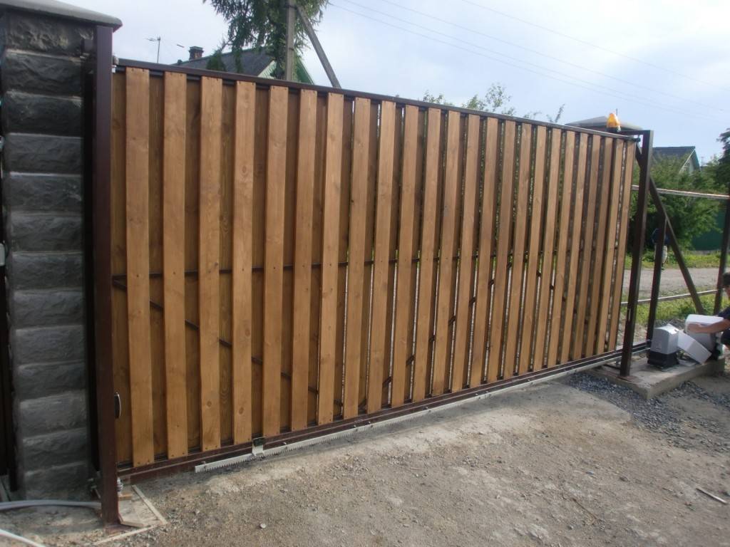 Обычно откатные ворота предпочитают отделывать материалами из древесины. При этом используют только строительное сырьё, качество которого сомнений не вызывает. Деревянное покрытие ворот должно быть устойчивым к механическим воздействиям, иначе оно быстро покроется трещинами и потеряет форму.
