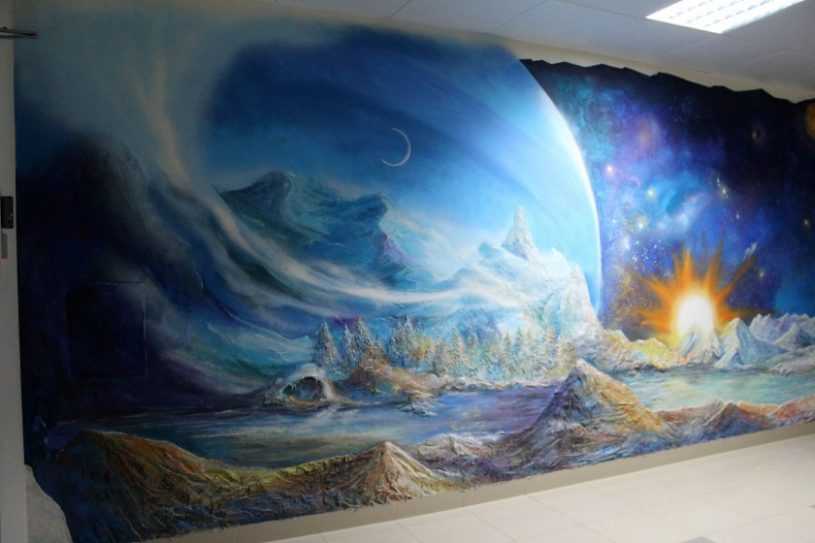 - объёмная роспись стен позволяет визуально расширить комнату и создать эффект «сломанного пространства». Помещения, оформленные в таком стиле, отличаются уникальностью. Данная техника позволяет имитировать любые архитектурные объекты, придавая им необычную концепцию: лестницу, скрывающуюся в небесах, балкон с видом на вселенную и многое другое. Основная особенность заключается в реалистичности необычного фантастического сюжета;
