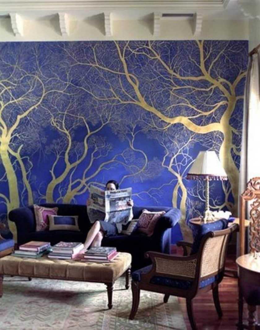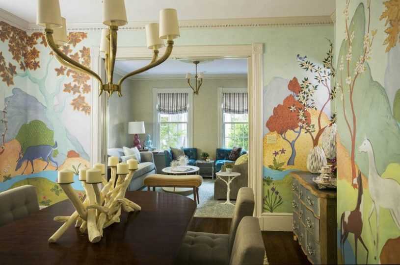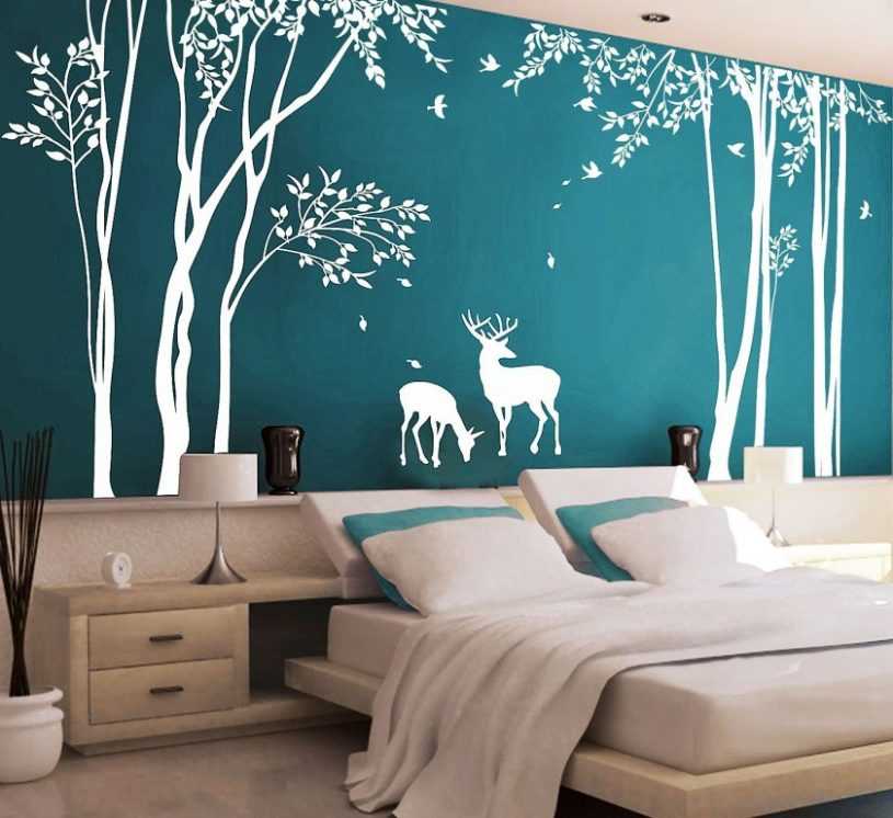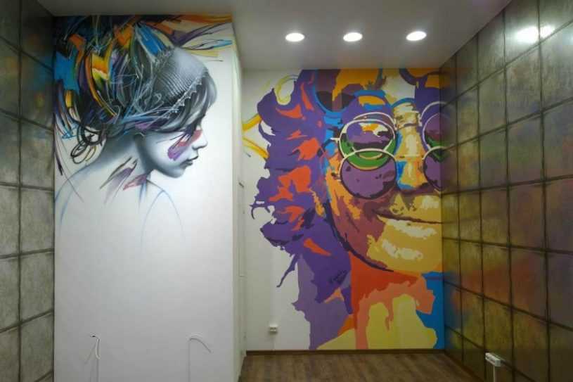 - акриловые краски — один из самых популярных методов оформления пространства. Краски обладают массой преимуществ: быстро сохнуть, не имеют запаха, легко наносятся и сохраняют насыщенный цвет даже под воздействием солнечных лучей. Роспись стен в интерьере при помощи акриловых красок потребует определённого мастерства.