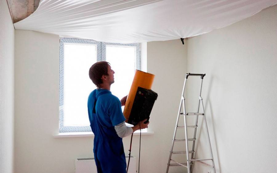 Перед началом работ по закреплению плёнки её нужно нагреть до 60о С с помощью строительного фена или тепловой пушки. Удобнее это делать, когда плёнка предварительно закреплена за углы в подвешенном состоянии с помощью специальных держателей.
