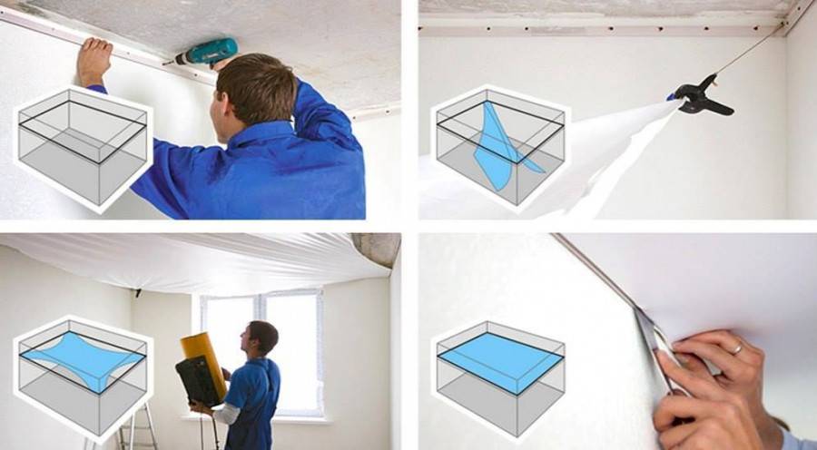 Полотно ПВХ крепится гарпунным способом. Крепежи уже зафиксированы на полотне. Эту операцию осуществляют при раскрое. Разогревают помещение тепловой пушкой и во время монтажа поддерживают температуру в помещении около 60°C. Пленку расстилают на полу и, закрепив по углам временные растяжки, подвешивают сначала с двух углов, расположенных по диагонали – начальный угол имеет специальную отметку. Фиксируют эти участки с помощью шпателя, затем делают то же самое с двумя другими углами. Потом заправляют полотно в центральных участках и закрепляют полностью вдоль длинных стен и вдоль коротких. Вставляют гибкую вставку, если она предусмотрена.