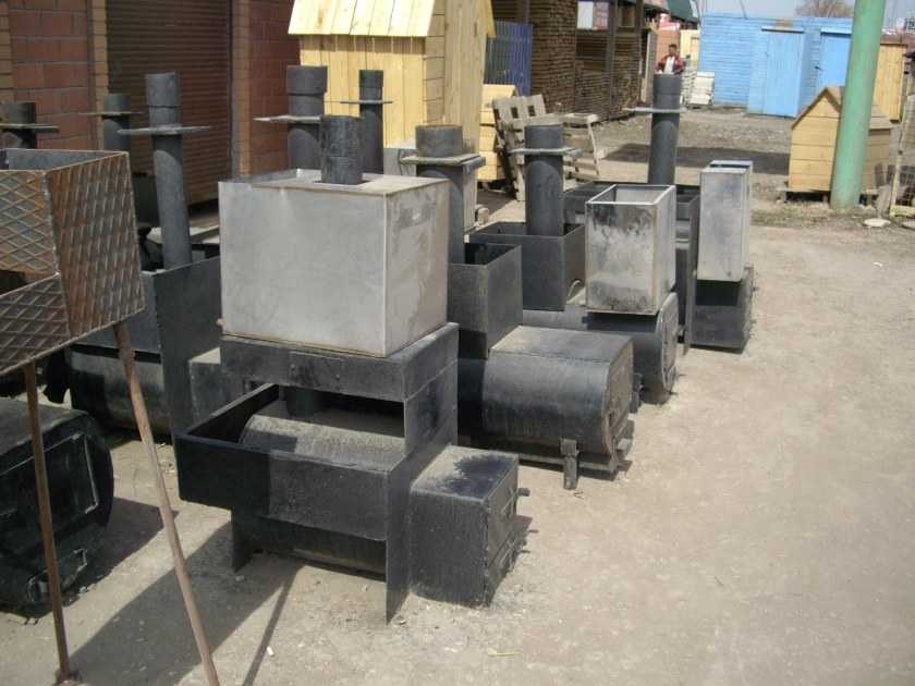 Вертикальная конструкция подойдет для большого котла, а горизонтальная – для нескольких меньших сразу. Последнее пригодится в животноводческом хозяйстве. Напр., для подмывания вымени коров и лап домашней птицы горячая вода нужна в небольших количествах, но достаточно долгое время. 2-3 сменяемых котелка обеспечат ее непрерывный поток, в т.ч. и на летнем выгоне/выпасе: печку из трубы такого размера можно возить в багажнике.